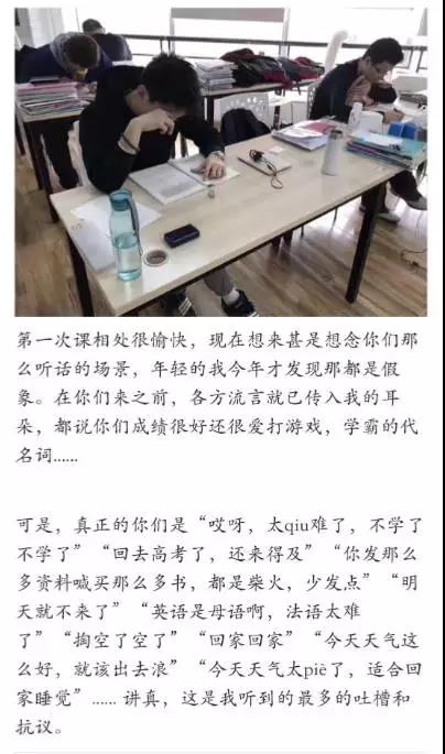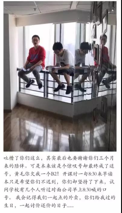 说来你们可能不信,他们真的是我校这么多年见到的第一个学霸天团。听杨老师说,她曾经只说过一次,希望他们再上课前半个小时就到教室背一下书,然后他们从那天起,就真的每天早上都是8:30就到学校了,甚至比我们学校的老师还早,于是成为了第一批非我校内部人员却拥有我们学校钥匙男人!而且出勤率几乎为100%,大老远来上课,带着病的时候都有,简直感动到哭泣!