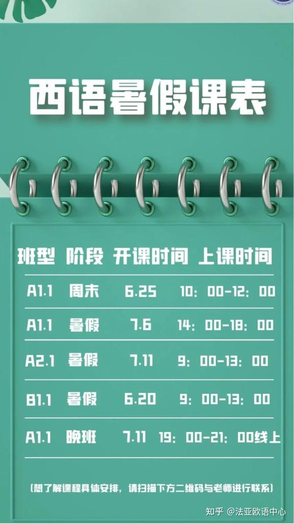 法亚在暑假为大家准备了各阶段的西班牙语课程,想来学习西语的同学,可以长按下方图片扫描二维码,与老师取得联系,获取最新的课程情况,也可免费预约试听课程哦: