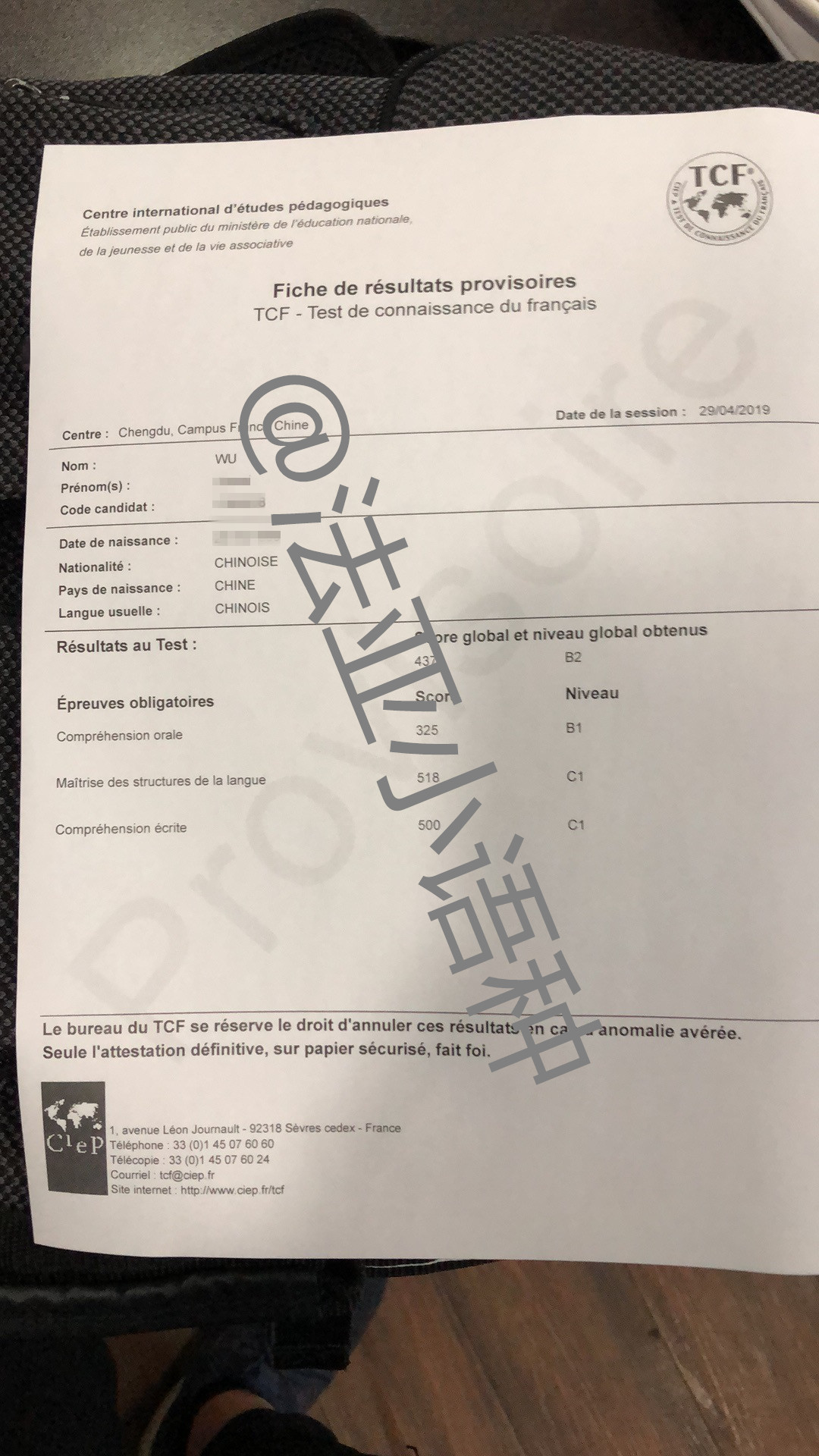 考试类型:TCF-B2所报课程:法语VIP课程法语杨莉老师的学生吴同学,4个月零基础VIP,学到了B1,目标是B1,结果考了B2等级!非常优秀!