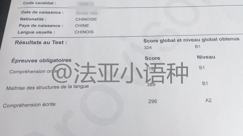 考试类型:TCF-B1所报课程:法语出国班法语陈晓艺老师学生,冯同学100课时从a1到b1的课程,顺利通过B1