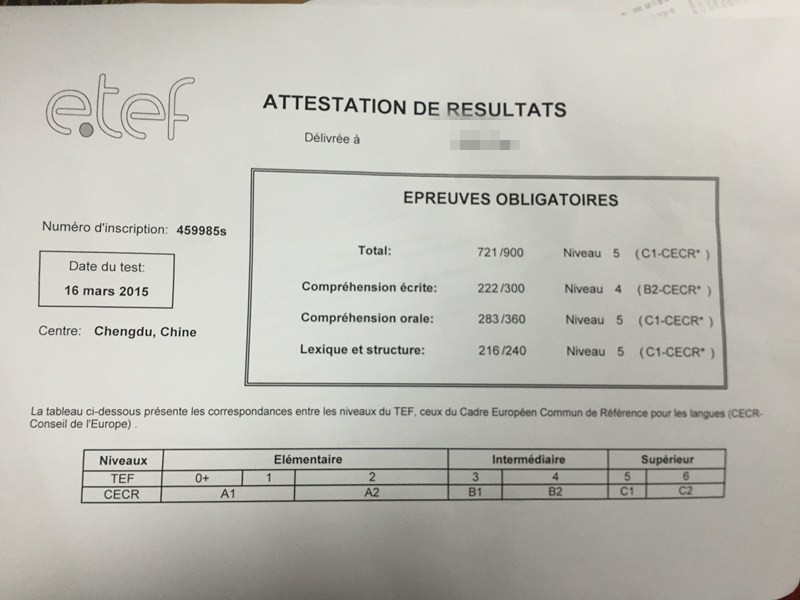 考试类型:TEF所报课程: