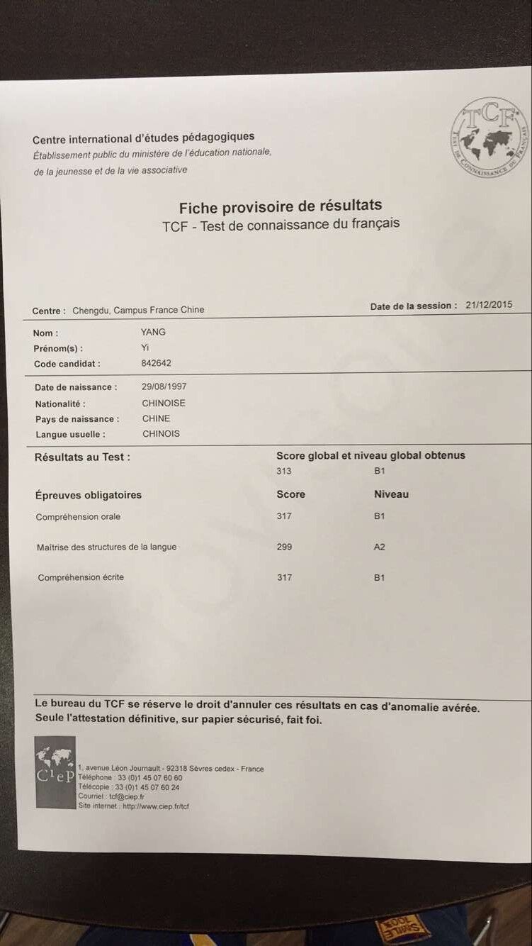 考试类型:TCF所报课程:出国班
