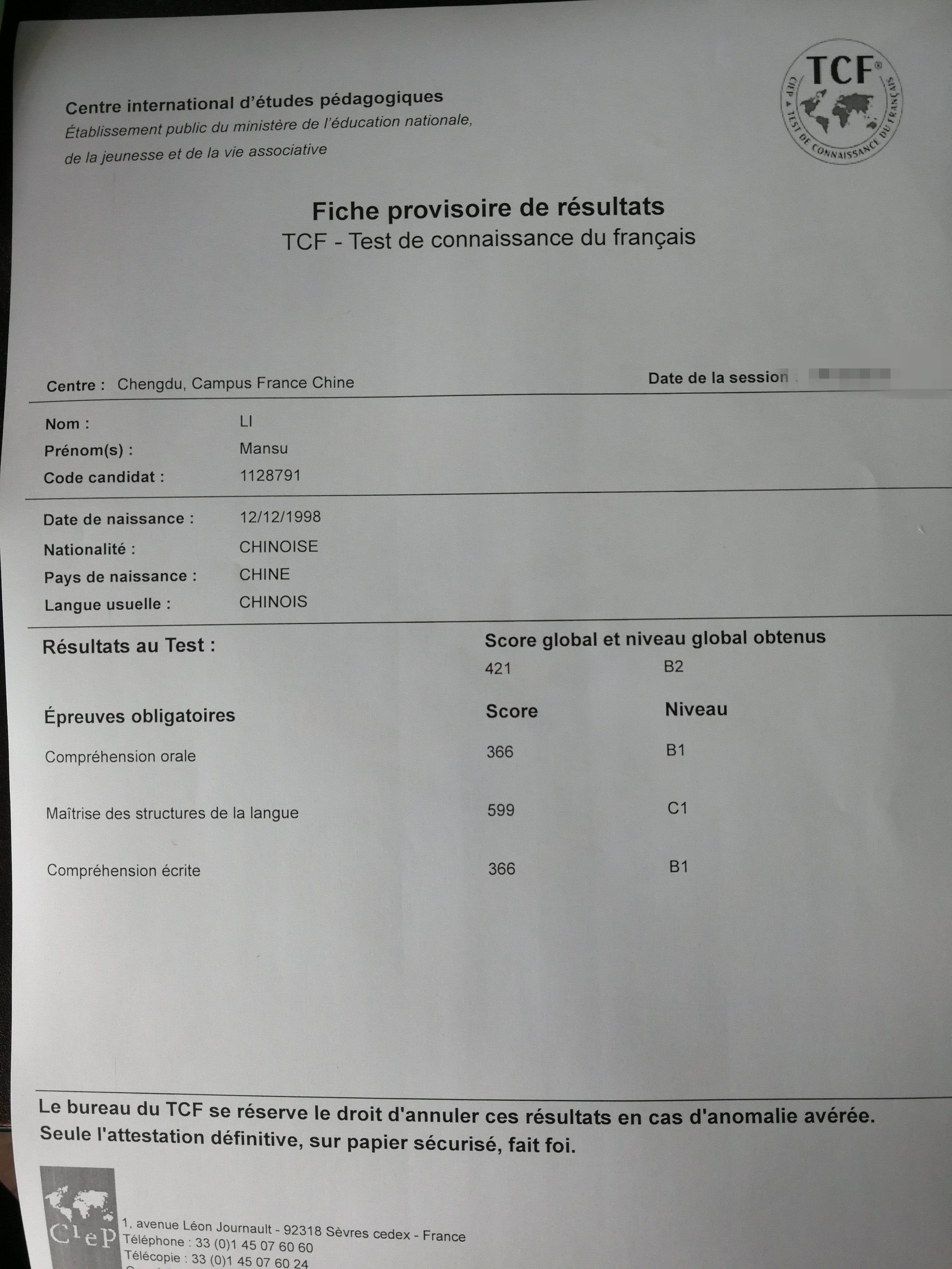 考试类型:TCF-B2所报课程:出国班