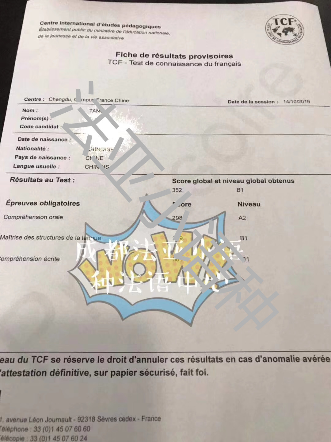 考试类型:TCF所报课程:法语出国班