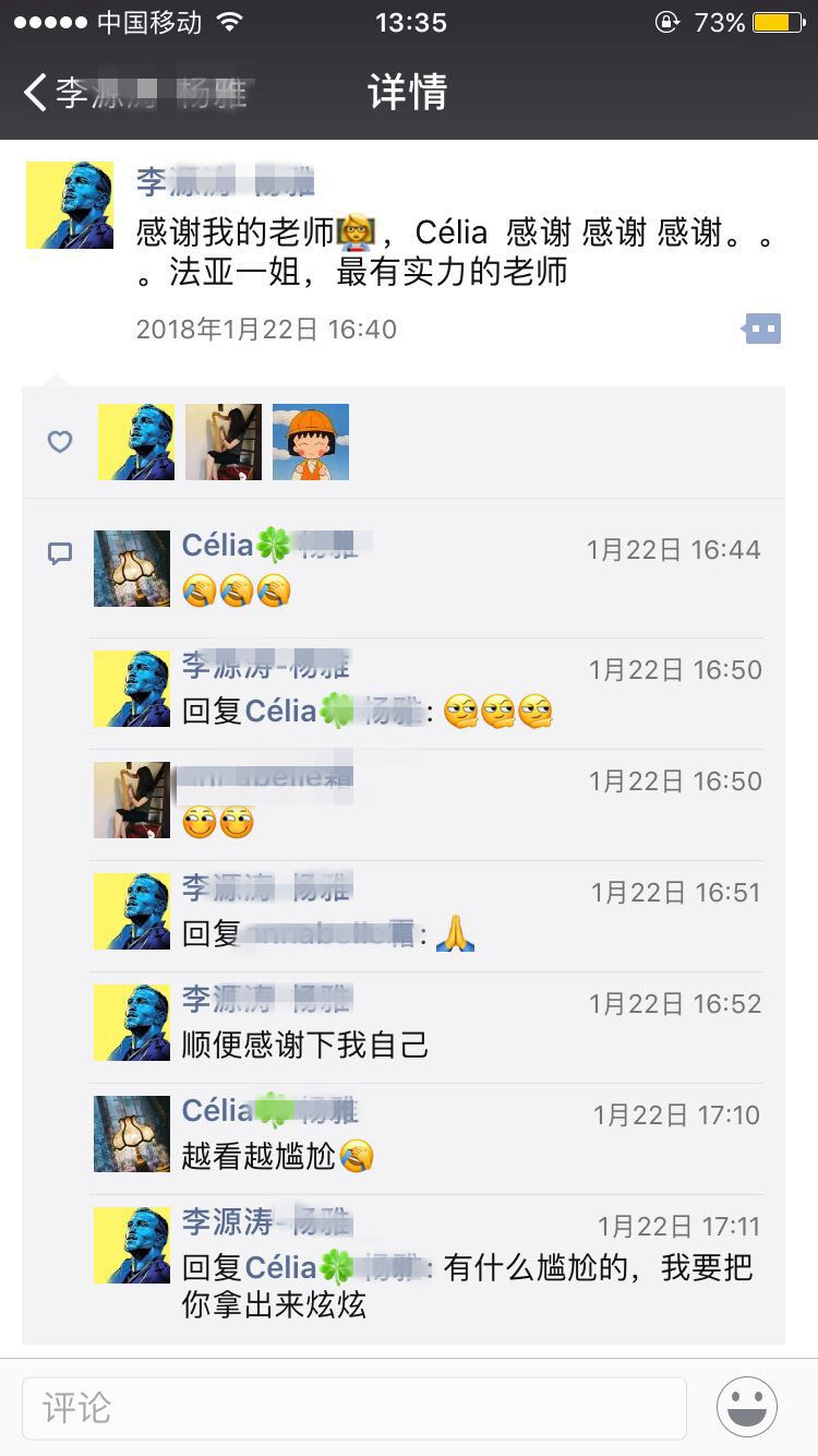 这位李同学是法语组杨雅老师班上的小可爱啦~经过几个月的学习,拿到了满意的成绩单,忍不住要将这个好消息告诉全世界!当然还要向全世界给我们的杨雅老师表白啦~杨老师辛苦啦~