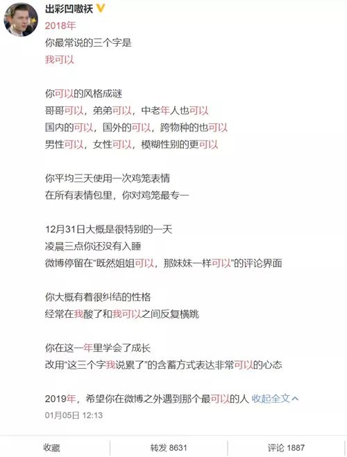 “我可以”这句话一般用来评价某个你很喜欢的人对你的吸引力过大,以至于你愿意为TA做任何事情。在颜性恋泛滥的如今,这句话经常出现在微博等社交平台,除了直截了当的“我可以”以外,还有一些常用搭配比如“姐姐可以,妹妹一样可以”、“我可以这三个字,臣妾已经说倦了”。