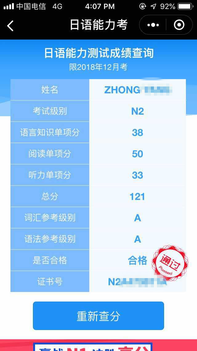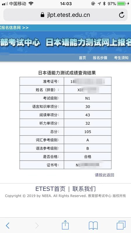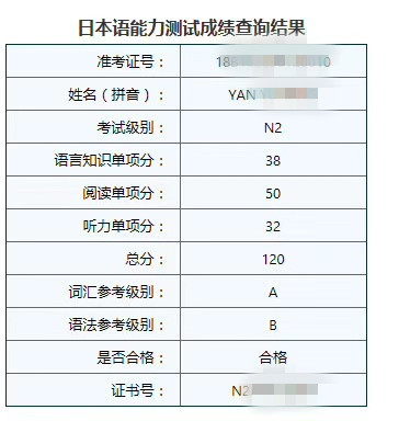 考试类型:JLPT N2所报课程:日语出国班倪同学日语JLPT能力考N2131分
