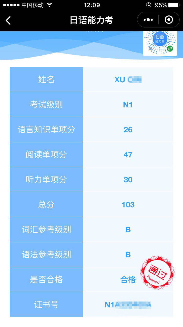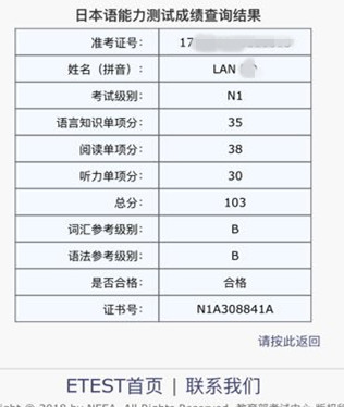 考试类型:JLPT—N1所报课程:出国班许晴同学日语N2成绩