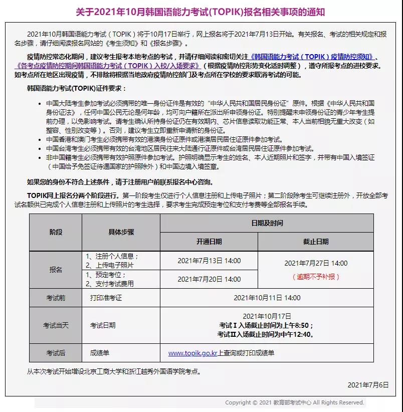 昨天,官方公布最新资讯,确定76届TOPIK中国大陆考试日程发布《关于2021年10月韩国语能力考试(TOPIK)报名相关事项的通知》,通知内容如下: