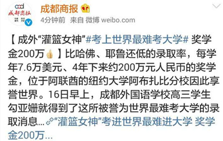 今天,一条【成都女生被全球“最难考大学”录取】的新闻火爆了微博,微信和各大门户网站,而这位18岁的成都女生和法亚也有千丝万缕的关系。