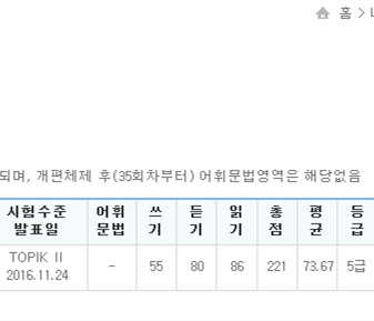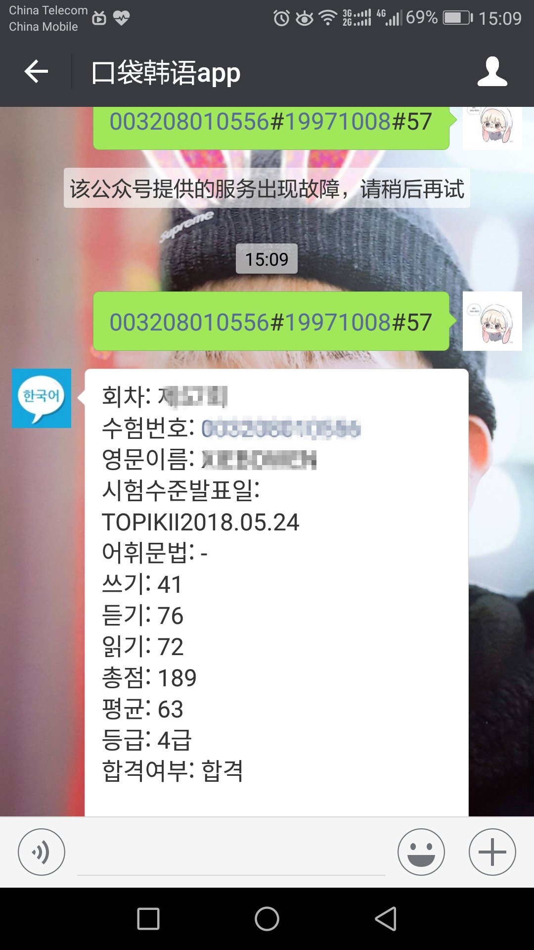 考试类型:TOPIK II所报课程:中级2谭同学韩语成绩