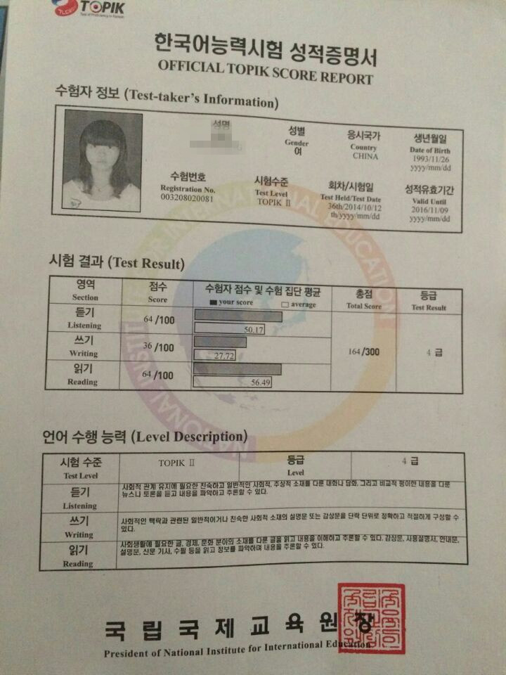 于同学是法亚韩语出国班的优秀学员,在韩语登记考试中获得优异成绩